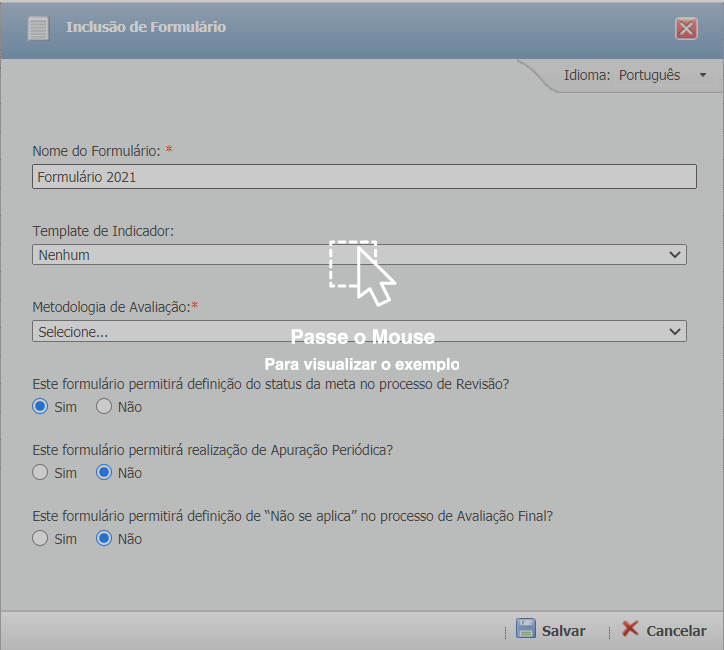 Dê um Nome ao Formulário que está sendo criado na tela de Inclusão de Formulário e informe se deseja usar algum tipo de Template de Indicador. Caso o produto seja utilizado em algum outro idioma (inglês ou espanhol), é necessário informar o Nome do Formulário nesses idiomas através do botão Idioma no canto superior direito da tela.