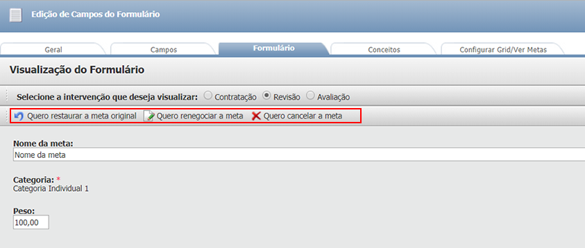 Para a intervenção Revisão, na tela do colaborador é possível restaurar a meta, renegociar e cancelar.