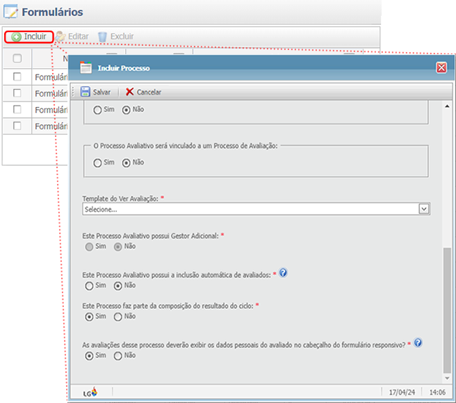 Para incluir um formulário, clique em   , e insira as parametrizações conforme o desejado.