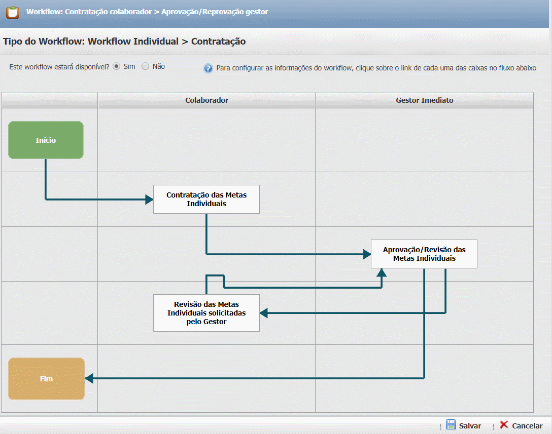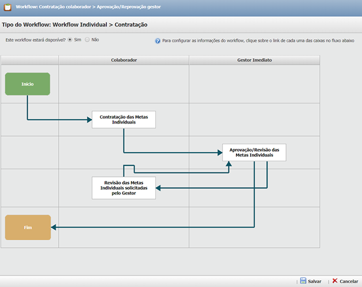 A funcionalidade Workflow, permite realizar configurações das atividades de Contratação, Revisão e Avaliação de workflows Individuais e de Grupos.