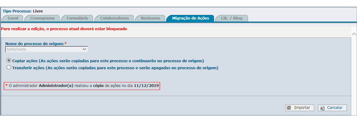 Ao realizar Cópia ou Transferência das ações, não mais será possível reimportar as ações ou importar ações de um novo processo livre.