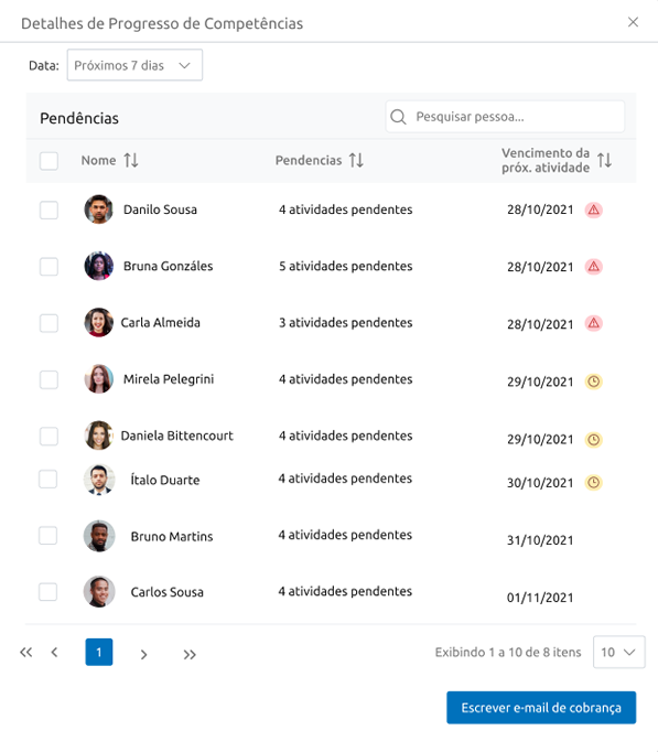 O campo Pendências, é constituído por uma caixa de Pesquisar Pessoa..., na qual é possível realizar a pesquisa de um funcionário específico, além das opções de Nome onde é possível visualizar o nome do funcionário e sua foto, Pendência que é mostrado quantas atividades estão pendentes de cada funcionário e Vencimento da próx. Atividade que além de mostrar a data do próximo vencimento, acompanha um ícone para alertar e mostrar o quão próximo está o vencimento.