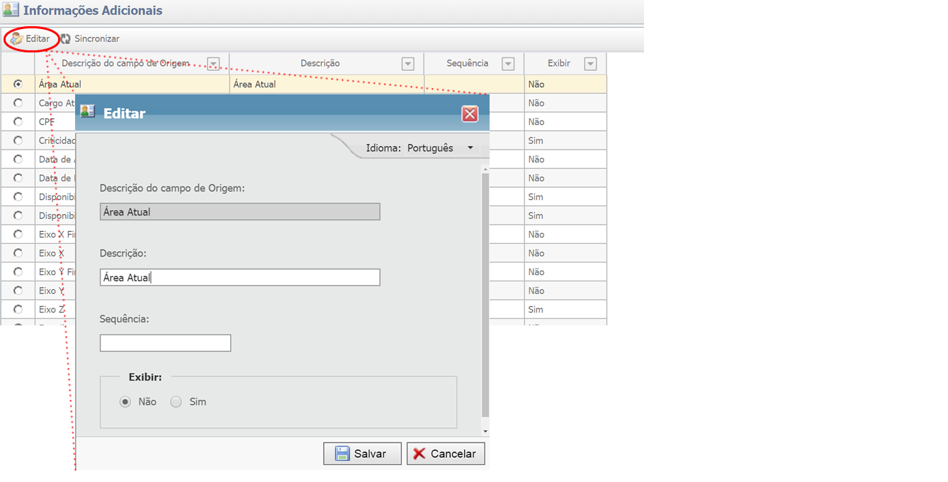 Após clicar em sincronizar a lista de campos de origem será atualizada permitindo ao administrados habilitar novos itens para exibição.
