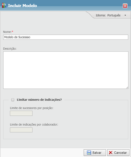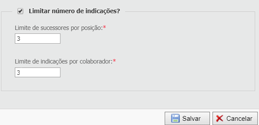 O modelo que possuir o campo Limitar número de indicações selecionado, apresentará os campos para determinar o limite de sucessores que podem ser indicados para cada posição e o limite de indicações que cada colaborador pode receber por posição e por colaborador obrigatórios.