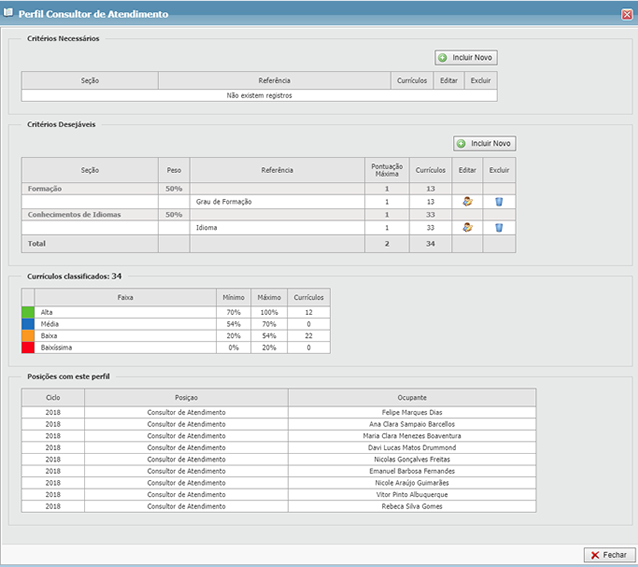 Na janela, visualize as posições associadas ao Perfil, os currículos classificados, os critérios desejáveis e necessários.