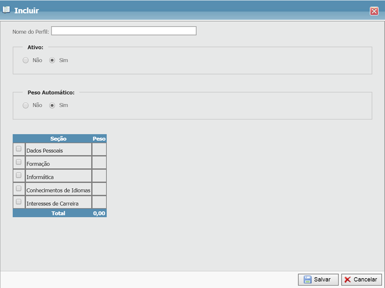 Ao clicar no botão  , será exibida a tela para incluir os critérios para o Perfil selecionado.
