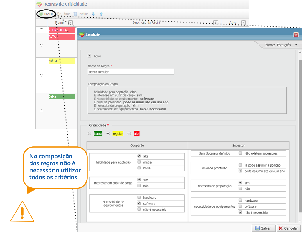 Regras de Criticidade, é um conceito que permite ao gestor definir vários níveis de criticidade que avaliarão os ocupantes e sucessores conforme o cadastro dos Itens para Análise .