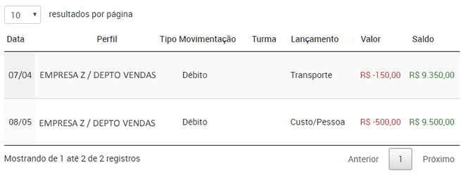 O sistema então disponibilizará uma lista das movimentações ocorridas durante o período de