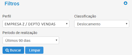 Um operador da Empresa Z gerou um extrato dos Deslocamentos ocorridos no departamento de vendas para os ultimos 90 dias. A seção de filtros foi preenchida conforme a imagem abaixo: