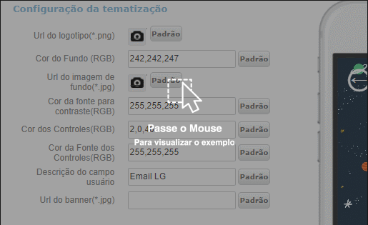 A medida que esses campos vão sendo preenchidos a simulação da tela de login vai sendo atualizada para demonstrar as cores e imagens escolhidas.