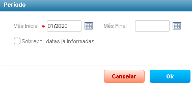 Ao selecionar um registro para ser orçado que não possua as datas iniciais e finais preenchidas, será exibida a janela Período para que nela sejam informados o Mês Inicial e o Mês Final do registro atual.