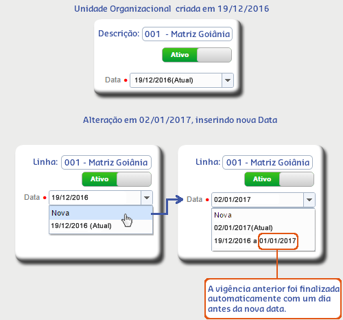 • Ao alterar algum dado da unidade organizacional e informar uma nova Data, inicia-se um novo período histórico que encerra o período anterior.