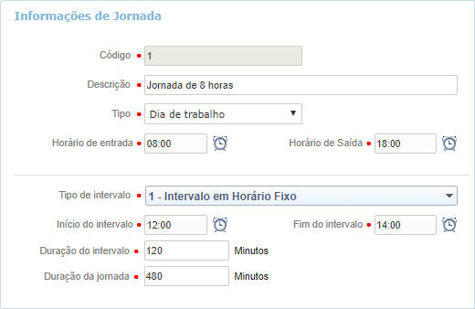 Nesta jornada o Horário de entrada estabelecido foi de 08:00 e o Horário de Saída de 18:00, com Intervalo em Horário Fixo com Início do intervalo às 12:00 e Fim do intervalo às 14:00. Desta forma a Duração do intervalo é de 120 Minutos (Fim do intervalo 14:00 - Início do intervalo 12:00) e a Duração da Jornada é de 480 Minutos (Horário de entrada 08:00 - Horário de Saída 18:00 - Duração do intervalo 02:00).