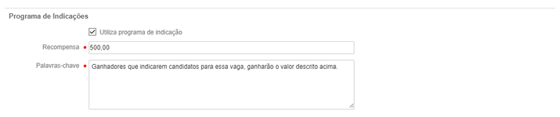 É possível informar que a vaga está participando do método de recrutamento por indicação. Esse método consiste em engajar os funcionários a indicarem potenciais candidatos. Caso um indicado seja contratado, o funcionário que o indicou é recompensado pela empresa. Para que a vaga cadastrada nesta requisição participe do programa de indicação, marque a opção Utiliza programa de indicação e informe a Recompensa que será dada à pessoa que indicar um candidato que seja contratado.