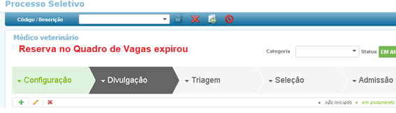 Quando uma Requisição de Pessoal utilizada em um novo Processo Seletivo ou em um Processo Seletivo já existente estiver com a Data fim próxima de sua expiração ou já estiver expirada, ao acessar um Processo Seletivo serão exibidas, a título de informação, as mensagens Reserva no Quadro de Vagas próxima ao vencimento e Reserva no Quadro de Vagas expirou.
