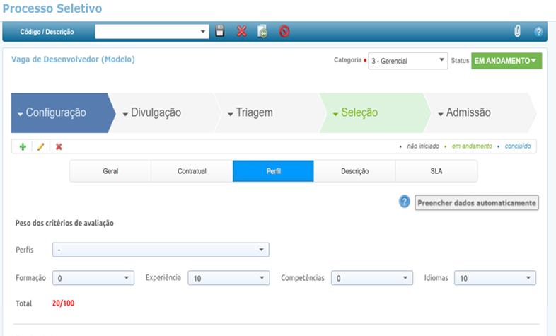 Posteriormente, parametrize os pesos dos parâmetros a serem utilizados, como: formação acadêmica, experiência e classificando os currículos considerando a aderência ao perfil divulgado.
