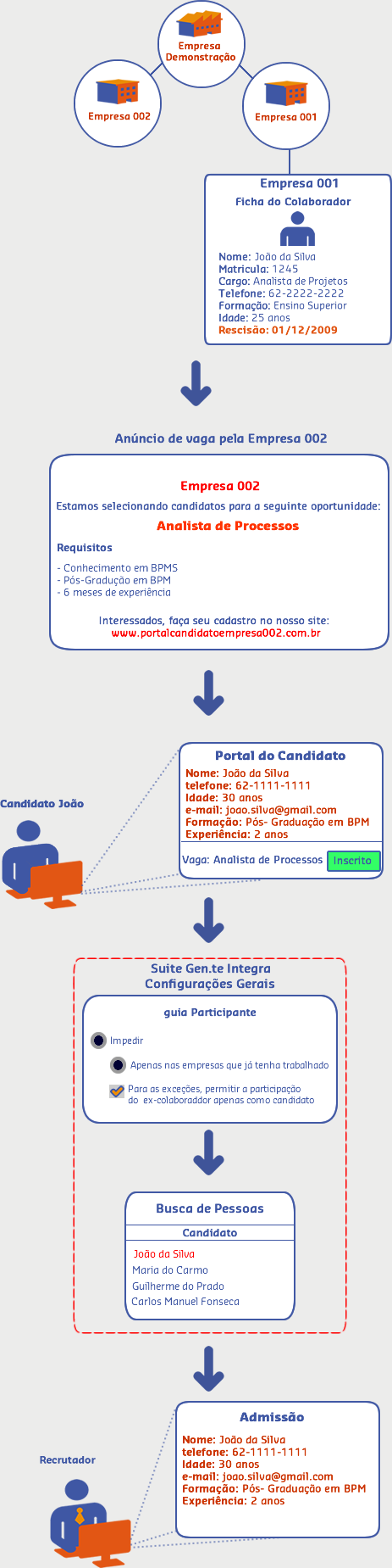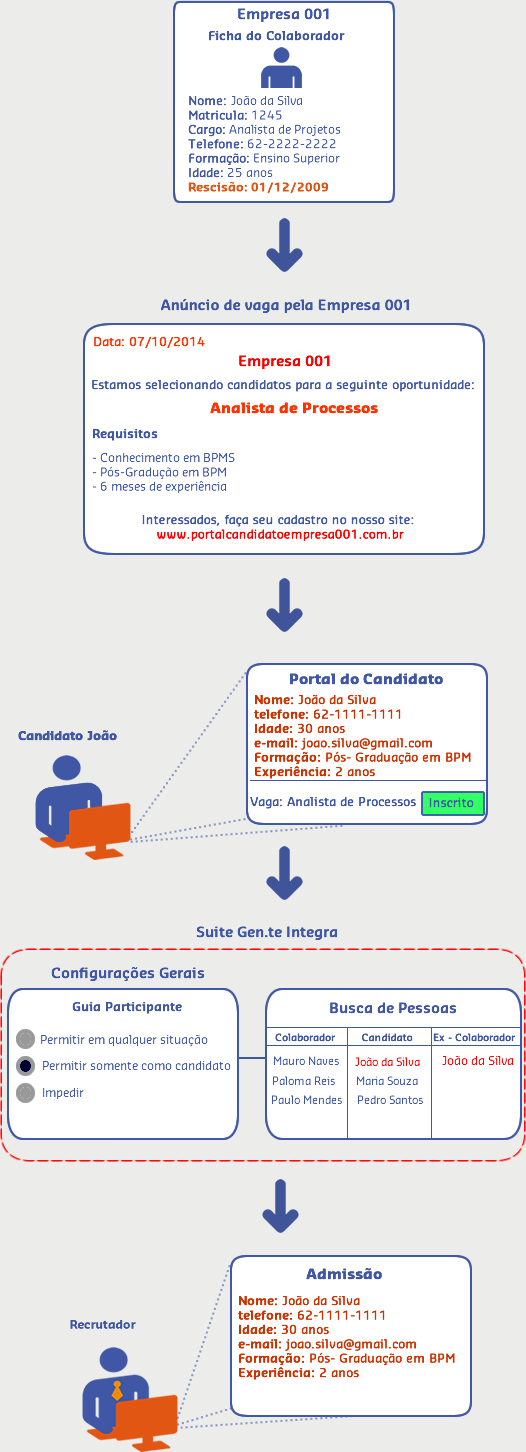 Na suite Gen.te Integra da empresa 001, nas Configurações Gerais guia Participante a opção Permitir somente como candidato está marcada, então, ao ser realizado o processo seletivo para esta Vaga, na Busca de Pessoas o cadastro do João da Silva constará tanto na lista de Candidato (mantendo as informações cadastradas no portal do candidato) como na de Ex-Colaborador (onde consta as informações antigas).