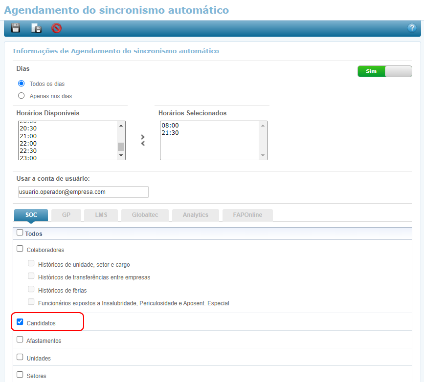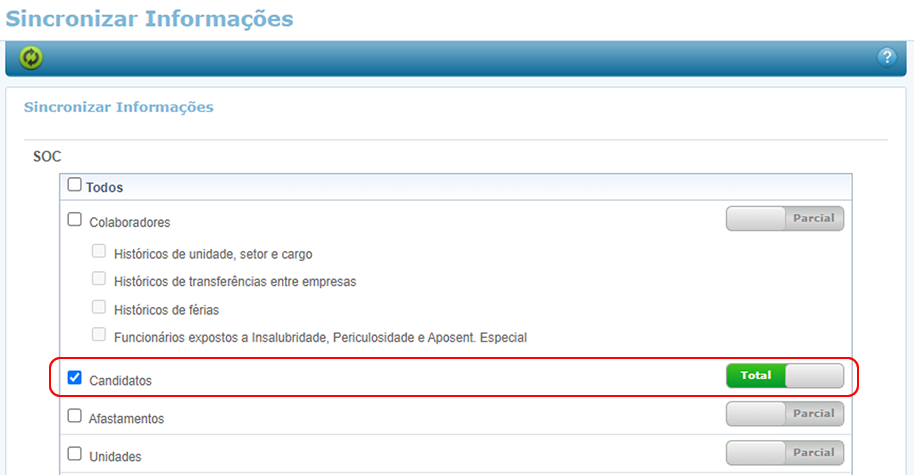 Dessa forma com os dois indicadores marcados, quando houver criação de um novo candidato ou a alteração de um já existente, eles serão levados e atualizados no parceiro SOC e além disso com a Sincronização ao fazer essas parametrizações será uma segunda forma de garantir a correspondência entre as informações na suíte gen.te e SOC.