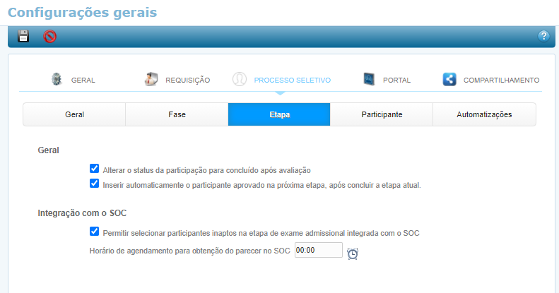 Se necessário, nas Configurações Gerais marque a opção Permitir selecionar candidatos inaptos na etapa de exame admissional integrada com o SOC para permitir que o candidato continue em um Processo Seletivo mesmo que tenha sido reprovado no Exame Admissional - ASO. Lembrando ainda, que neste caso, caso a opção seja marcada, o Horário da atualização automática do parecer dos participantes também deverá ser informado.