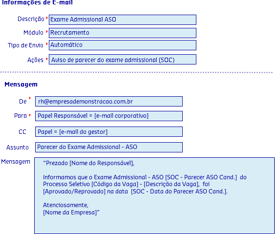 Através da funcionalidade E-mail você poderá realizar a parametrização para que o Aviso de parecer do exame admissional - SOC, seja feito de modo Automático, informando ao responsáveis via E-mail, o resultado do Exame Admissional - ASO.