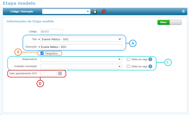 Por fim, defina o Status da etapa modelo, ao optar por Ativo a etapa estará disponível para associação em um Grupo de Etapas, e ao Inativá-la a etapa modelo apenas deixará de ser apresentada na lista de etapas modelo para compor um novo Grupo de etapas.
