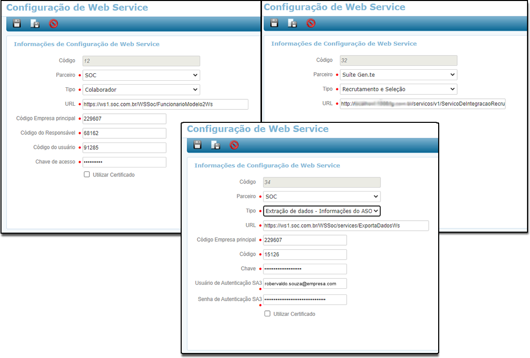 Para esse primeiro passo deveremos parametrizar para dois tipos de Parceiros, sendo eles o parceiro SOC e Suíte Gen.te, e os Tipos Extração de dados - Informações ASO e Recrutamento respectivamente.