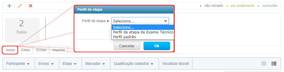 Na etapa de Seleção nosso primeiro passo será incluir uma etapa interna, veja como prosseguir: