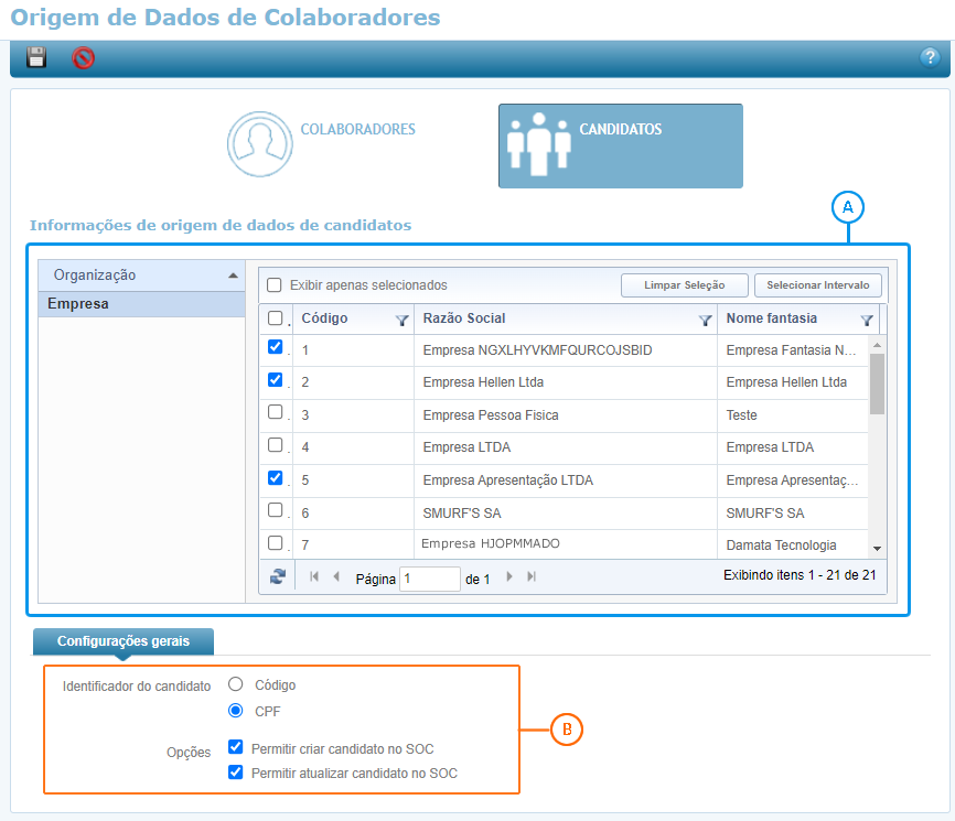 Nesta funcionalidade você deverá informar qual Empresa e quais as Configurações gerais serão utilizadas para originar os dados dos colaboradores no parceiro SOC.