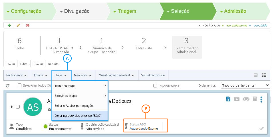 Após inserir a etapa interna na Seleção do processo seletivo, você poderá selecionar os candidatos que foram aprovados e que deverão agora participar da etapa de Exame Médico - SOC.