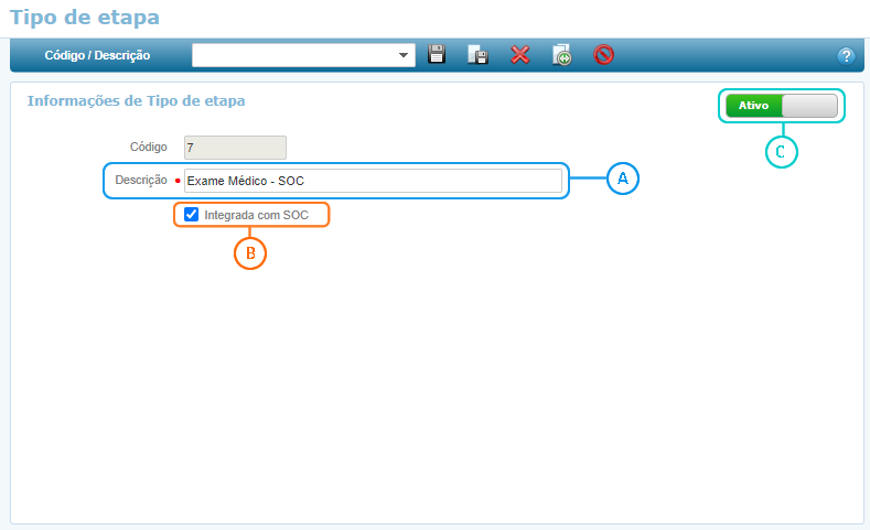 No cadastro do Tipo de Etapa, você irá cadastrar o tipo de etapa para a integração do SOC que posteriormente será utilizada na fase de Seleção do Processo Seletivo.