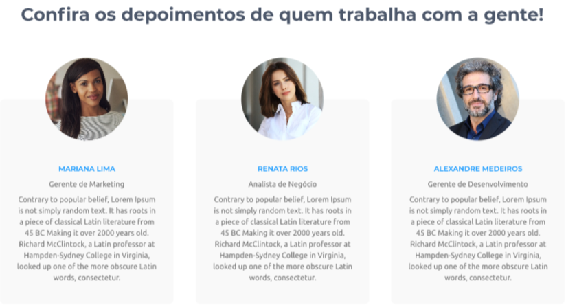 Em informe o Título da Seção Depoimentos, após isso, clique no botão Adicionar Depoimento para inserir os dados do responsável pelo depoimento. O sistema permite que seja incluído até 3 depoimentos reais e dependerá da estratégia adotada na empresa para divulgação.