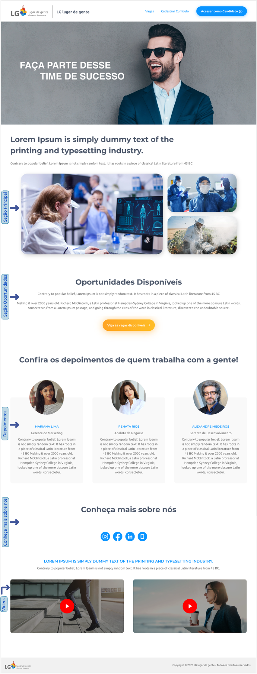A Página de Carreira foi criada para que o administrador da ferramenta tenha autonomia para cadastrar diversas informações podendo ser relacionadas à cultura, visão, missão e aos valores da empresa. Além disso, é possível incluir textos informativos referentes ao processo seletivo, vídeos, fotos e apresentação de depoimentos de colaboradores. Dessa forma, o objetivo desta página é ser um cartão de visita e uma apresentação da empresa, não somente ao candidato, mas a todos os públicos.