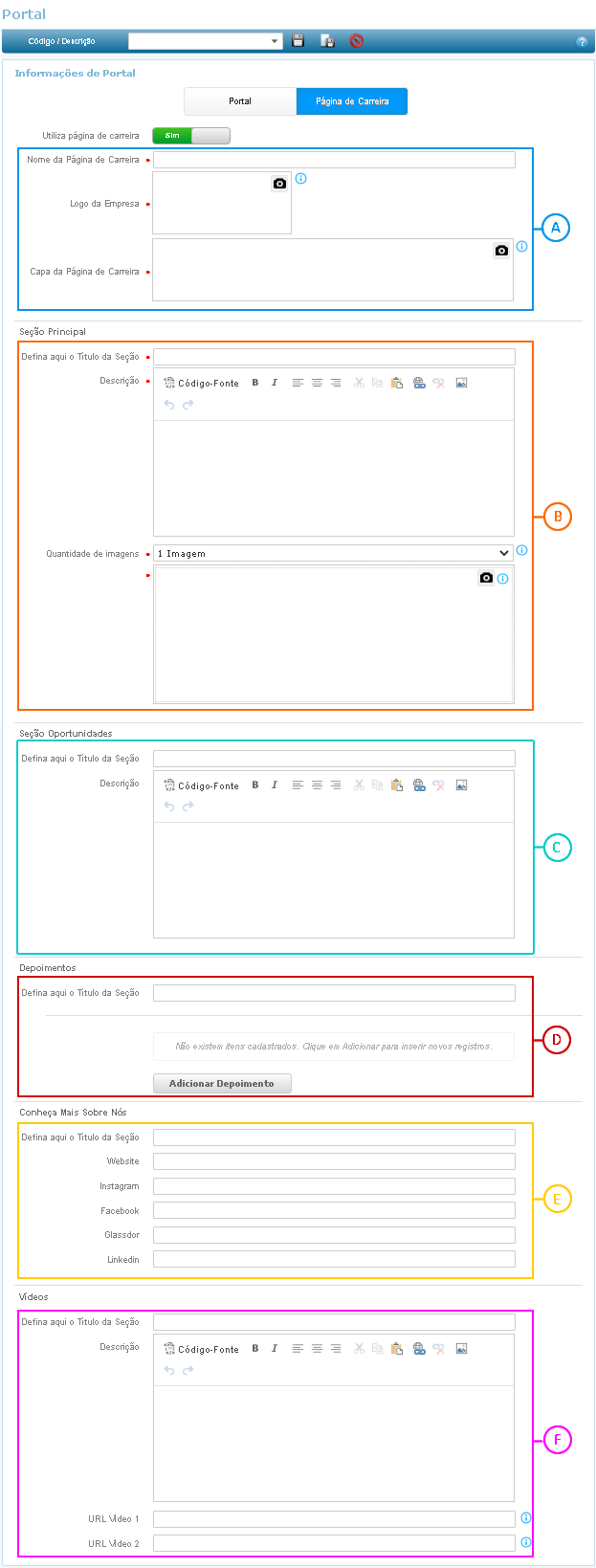 Marque como Sim a opção Utiliza página de carreira para que sejam apresentados os campos configuráveis.