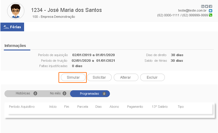 No formulário de Férias clique em Simular, para que seja disponibilizado o formulário de Simulação de Férias.