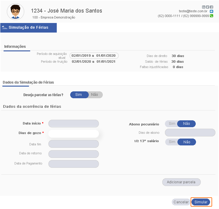 Clique no ícone , selecione a opção Simulação de Férias. Em seguida será apresentado o formulário de simulação.