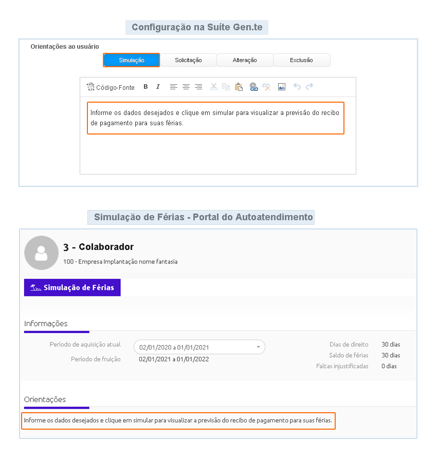 Através do processo de Simulação de Férias, é possível realizar uma solicitação de férias em condições semelhantes ao processo real, de forma ágil por meio do Portal do Autoatendimento. Para que isso ocorra, é necessário realizar algumas configurações disponíveis na Suite Gen.te. Portanto, nesse tutorial vamos orientá-lo a realizar configurações necessárias, para utilização do processo de Simulação de Férias.