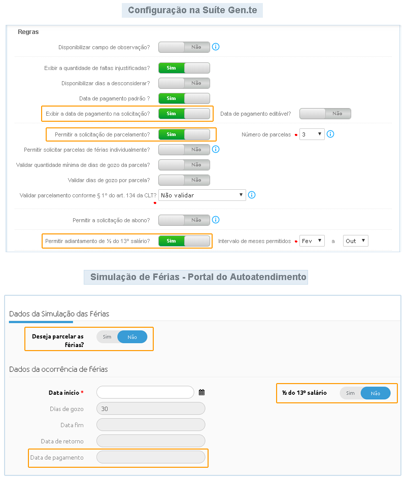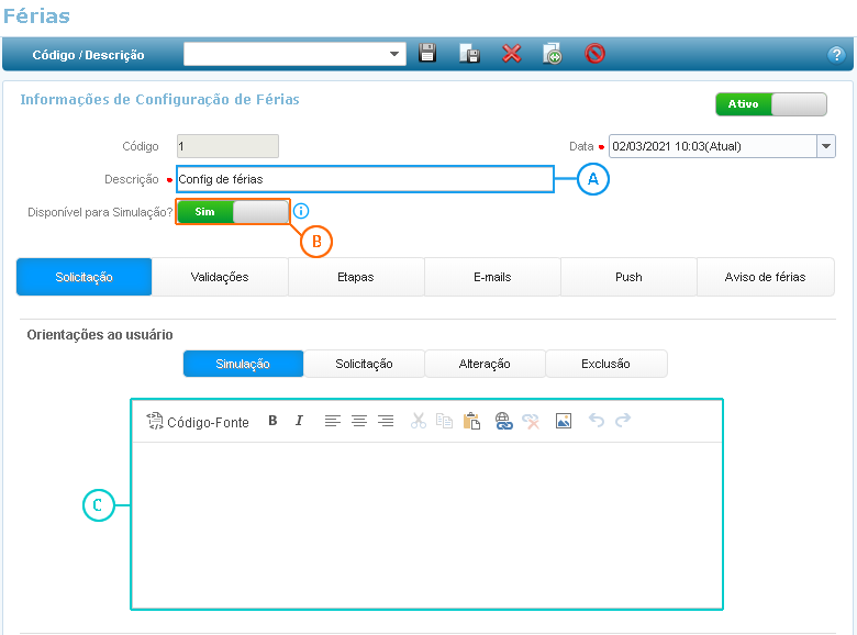 A configuração de Simulação de Férias é disponibilizada somente na guia Solicitação.