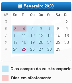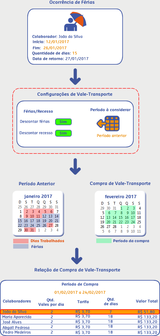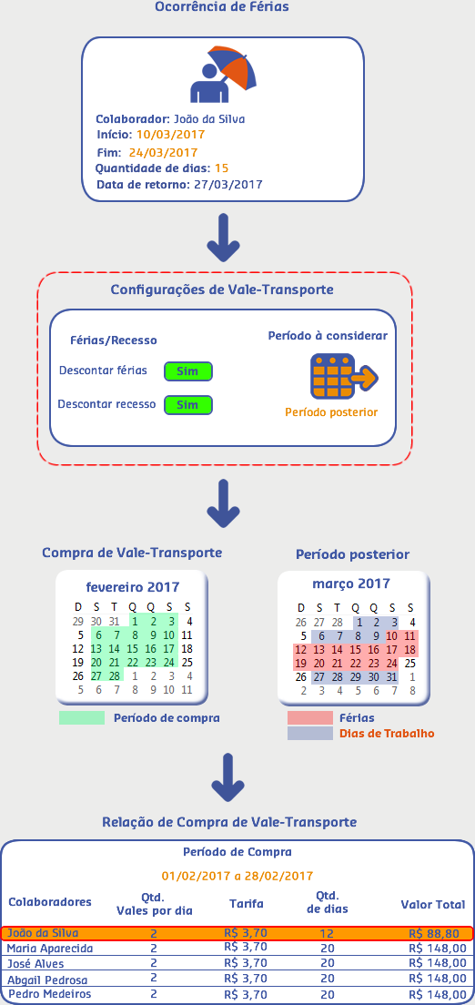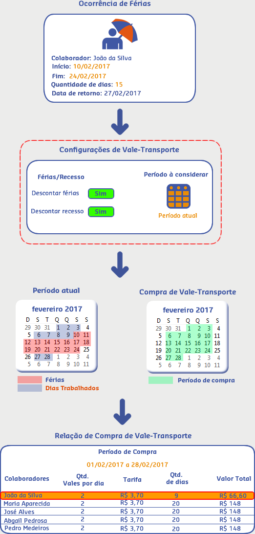 Sendo assim, quando realizada a compra para o período atual (01/02/2017 a 24/02/2017), o sistema verificou que no período passado teve uma ocorrência de férias para o colaborador João e efetuou o desconto de vales de acordo com os dias que ele ficou ausente na empresa.