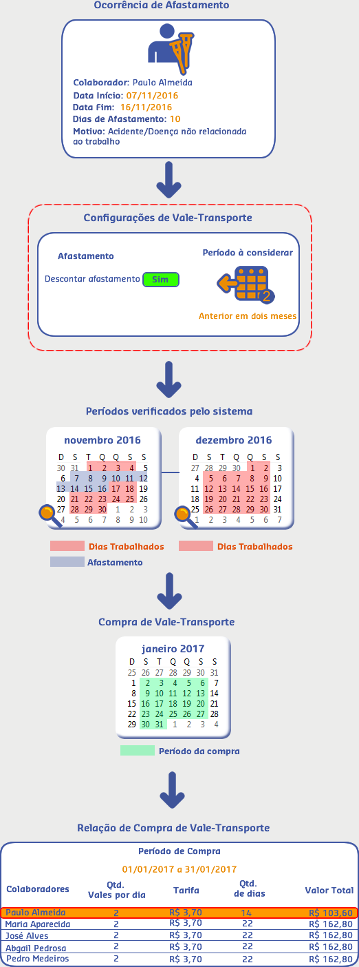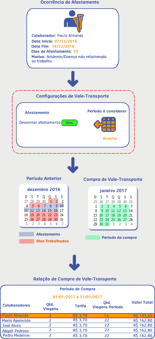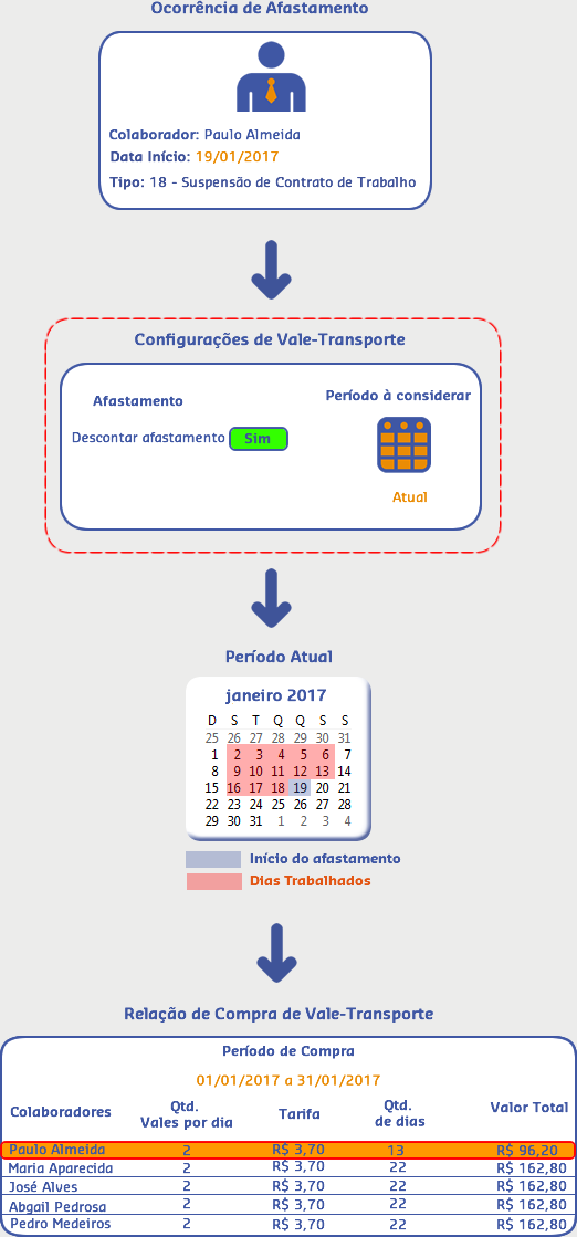 Sendo assim, quando realizada a compra para o período atual (01/01/2017 a 31/01/2017), o sistema verificou que no período anterior houve uma ocorrência de afastamento para o colaborador Paulo, então efetuou o desconto de vales de acordo com os dias que ele ficou ausente na empresa.