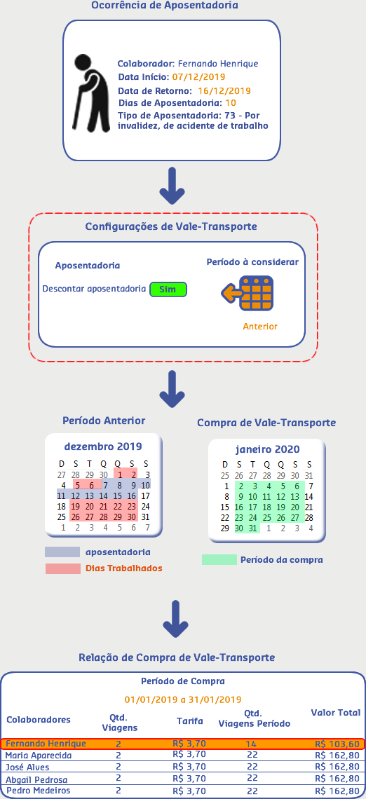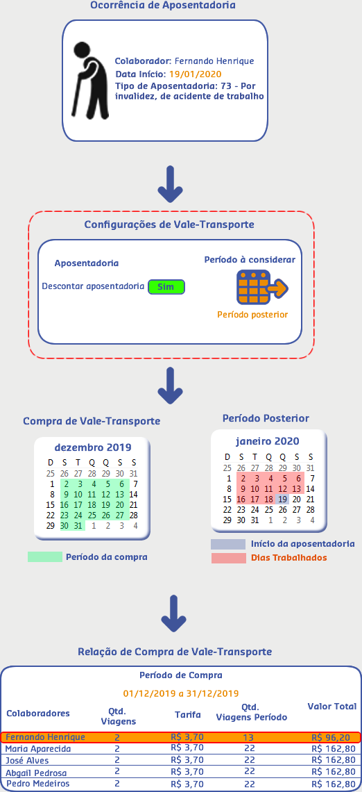 O colaborador Fernando Henrique teve uma ocorrência de aposentadoria cadastrada com início no dia 07/12/2019 e fim 16/12/2019, sendo 10 dias de aposentadoria. Nas Configurações de Vale Transporte, está parametrizado para descontar aposentadoria considerando o período anterior.