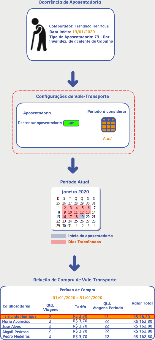 Sendo assim, quando foi realizada a compra para o período atual (01/01/2020 a 31/01/2020), o sistema verificou que no período anterior houve uma ocorrência de Aposentadoria para o colaborador Fernando Henrique, com isso efetuou o desconto de vales de acordo com os dias que ele ficou ausente na empresa durante o mês anterior.