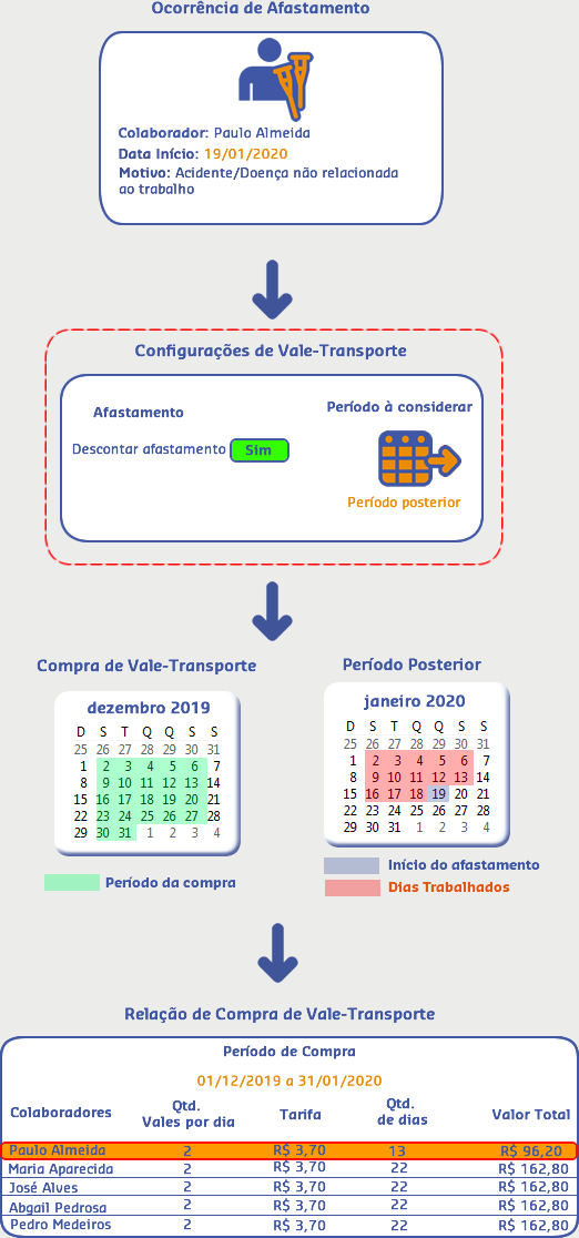 O colaborador Paulo Almeida tem uma ocorrência de afastamento programada, com início em 19/01/2020. Nas Configurações de Vale Transporte, está parametrizado para descontar afastamento considerando o período posterior à compra.