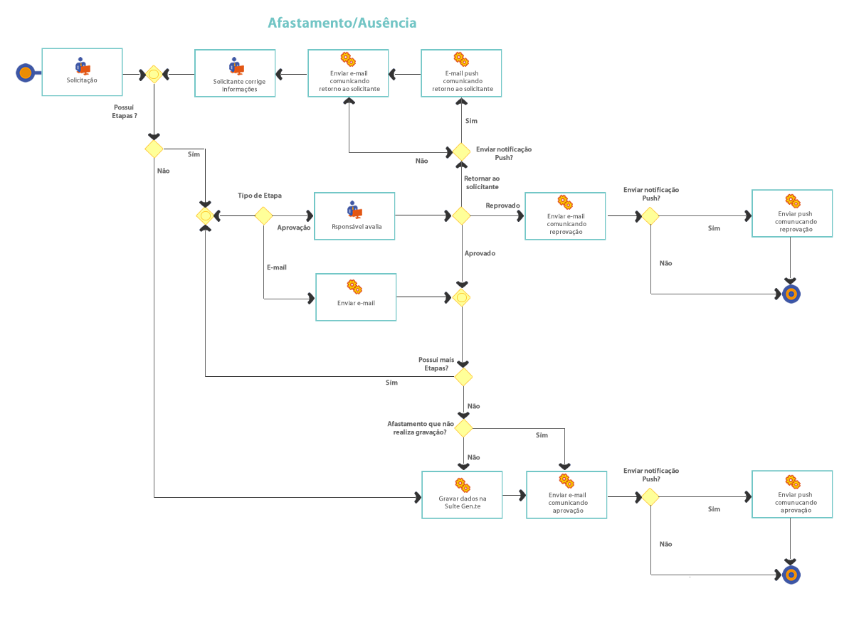 Através do fluxo parametrizável de afastamento/ausência é possível cadastrar os perfis de afastamento que serão utilizados pelo usuário através do Portal de Autoatendimento.