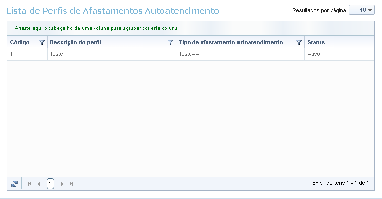• Agrupar por Código, Descrição, Tipo de afastamento ou Status. Para isso, arraste a coluna para o local indicado.