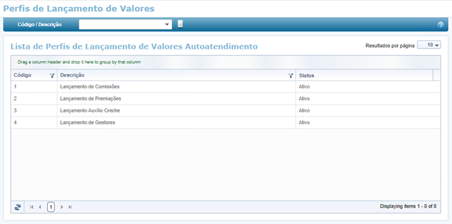 Ao abrir essa funcionalidade, é apresentada uma relação dos Perfis de Lançamento de Valores já cadastrados: