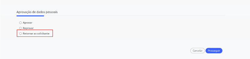 A equipe de RH responsável pela análise e aprovação da documentação de Alteração de Dados Pessoais. Como no Processo Parametrizável de Alteração de Dados Pessoais o indicador Disponibilizar opção para retornar o processo ao solicitante? estava marcado, foi possível para o RH retornar ao solicitante o processo ao marcar a opção Retornar ao Solicitante, permitindo assim que o colaborador anexasse o documento faltante.