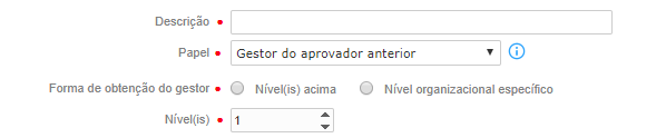 • O Papel do responsável pela aprovação, podendo ser: Solicitante, Gestor do alvo, Gestor do solicitante, Gestor do aprovador anterior, Grupo de colaboradores, ou Pessoas do grupo de colaboradores.